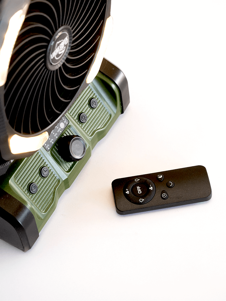 Packed with a massive 20,000mAh rechargeable battery, this fan runs up to 75 hours on low or 18 hours on high, helping to reduce condensation and keep air flowing through your tent or awning setup. It features variable fan speeds, an oscillating head, dual dimmable lights (warm and cool white), and even comes with a remote control for easy operation.